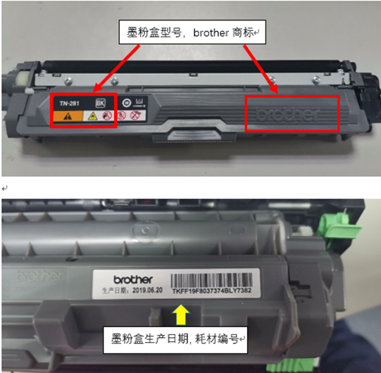 2,兄弟正品墨粉盒外壳都有兄弟公司的商标,墨粉盒型号,生产日期,编号。