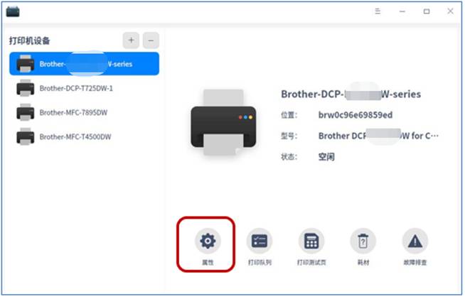 A,选择打印机设备型号,点击“属性”图标,进入打印机属性页面;