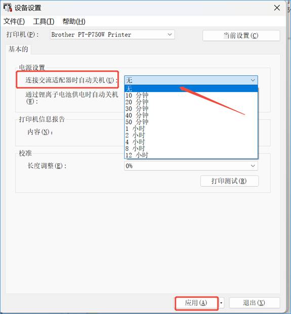 3、 将电源设置连接交流适配器是自动关机设置为无,然后点击应用