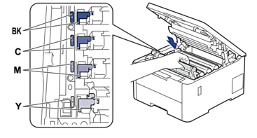 )。滑块上的箭头必须与硒鼓单元上的箭头对齐。否则,打印出的页面中会出现纵向条纹。