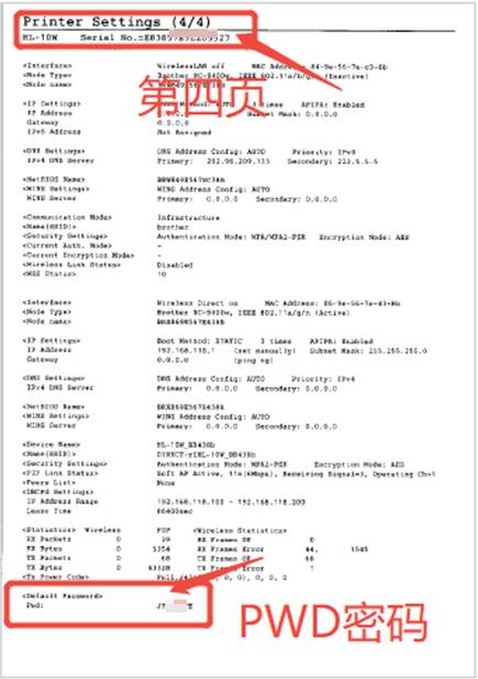 在报告的第四页中可以查看打印机ip地址和PWD密码。